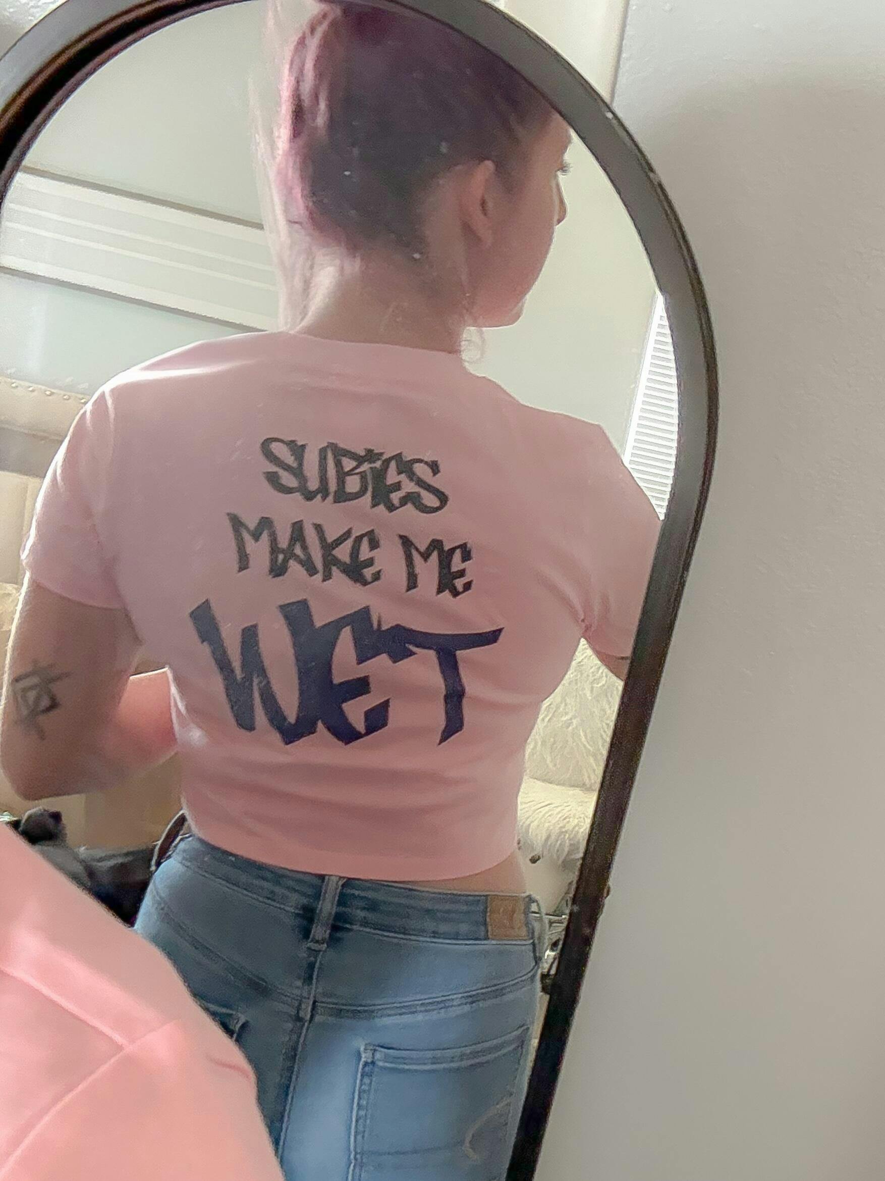 Women's Subaru T-Shirt Subie Elites Baby Tee featuring the design 'Subies Make Me Wet'. This slim fit tee is made of 100% organic cotton, printed using Direct-to-Film (DTF) technology. Perfect for Subie enthusiasts who want to show off their love for their car in a flattering and stylish way. Great for casual wear or car meets and events.