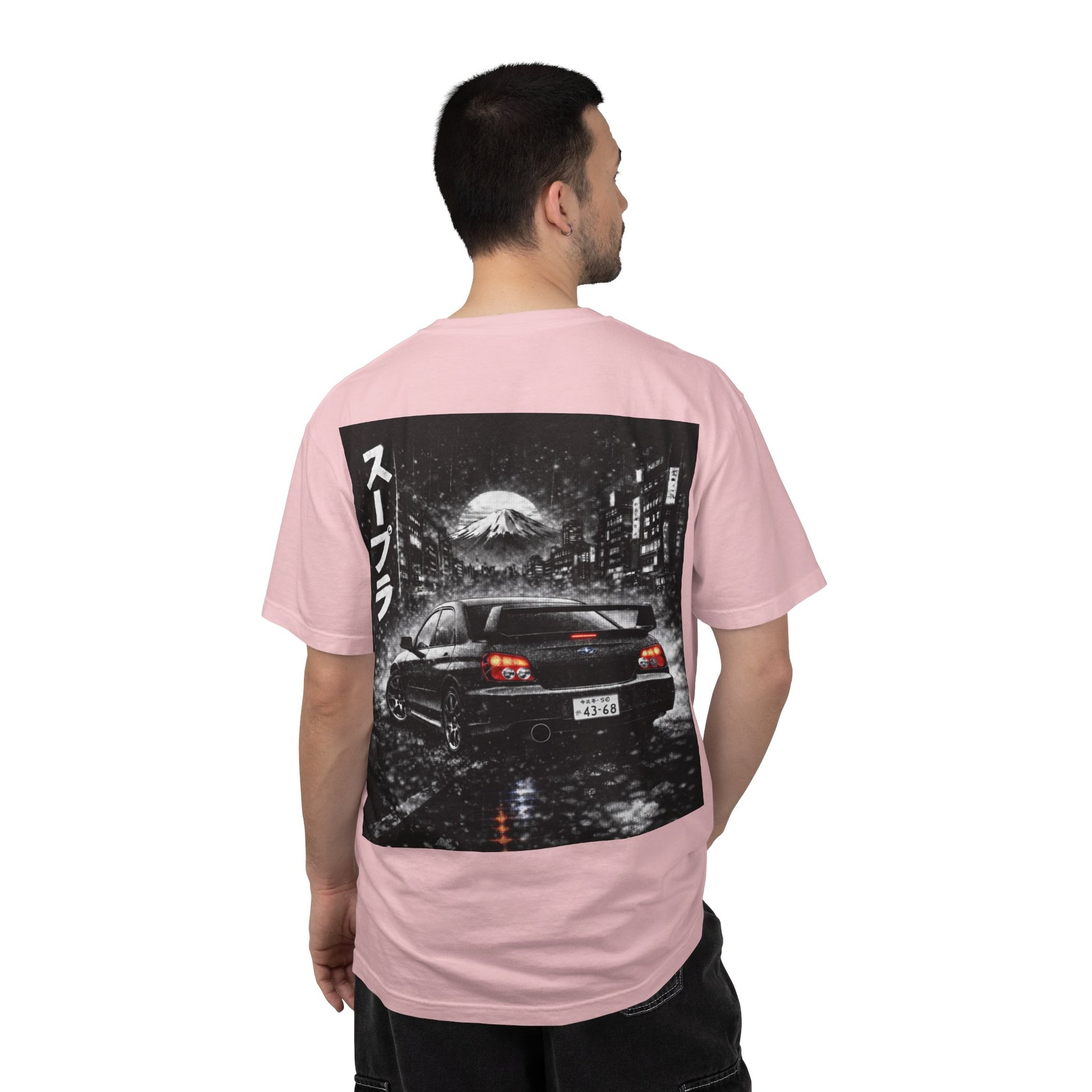 This heavyweight, garment-dyed tee carries the quiet thrill of late-night street runs and rainy city neon. The relaxed cut feels lived-in from day one — soft, slightly faded, and built to last. On the chest sits a subtle laurel-logo, while the back displays a moody monochrome scene: a sleek sports car parked under city lights with distant Mount Fuji and Japanese characters nodding to JDM culture. Wear it after a night cruise, layered under a flannel, or with worn denim to keep that underground, tuner-inspired vibe. The shirt settles into your rotation and tells a story of asphalt, light reflections on wet pavement, and the slow hum of an engine warming up.